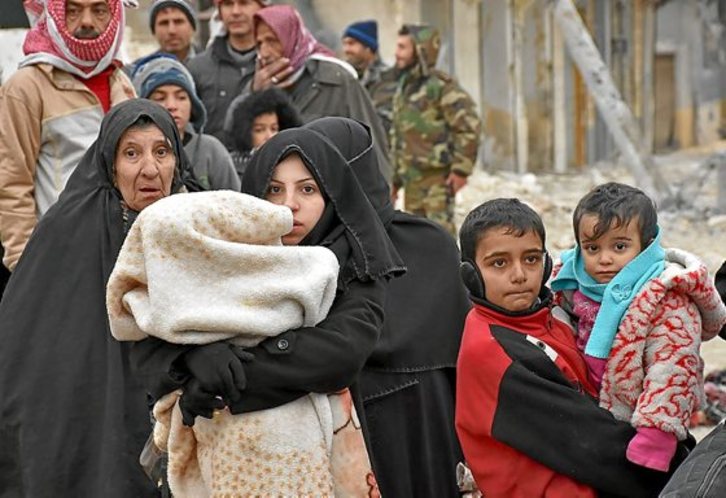 Duela gutxi arte, Alepo hiriko auzo matxinoetan bizi ziren siriarrak etxean hiltzen ziren, Baxar al-Assaden indarrek botatzen zizkieten bonben artean. Orain, berriz, bertatik bizirik ateratzea lortu dutenek kontatu dutenez, kalean erabat txikitutako gorpuzkiak ikus daitezke. AFPko kazetariak obus batek eragindako txikizioa ikusi ahal izan du aste honetan. Bere aurrean zihoan neska txikia erabat itxuragabetuta utzi zuen leherketak. Kasko zuriek ezin dute laguntza handirik eman, anbulantziarik gabe geratu dira-eta. Lehen hegazkinen hotsak ohartarazten zituen eta ihes egiten zuten, baina orain artilleria ari da etengabe suntsiketa lanean, eta alde egiteko aukerarik ere ez dute izaten. 30.000 lagun inguruk lortu dute Alepoko ekialdetik ateratzea: janaria ematen diete, baina askok ez dute aterperik gaua pasatzeko. Ebakuntzak egiten dira sotoetan, baina anestesiarik gabe. Hotzari aurre egiteko, dituzten gauzak erretzen dituzte. Hala ere, Alepon geratu direnak baino hobeto daude: laguntzarekin eta bonbarik gabe.