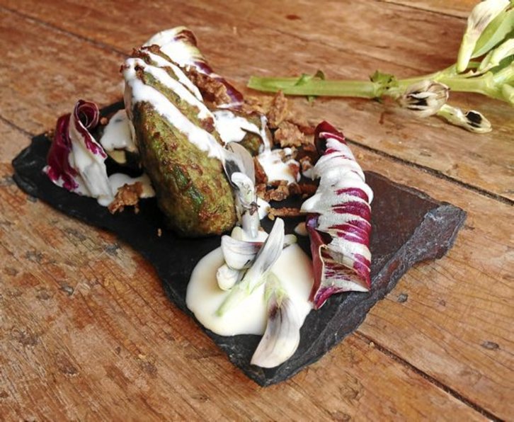Baba falafela alioliarekinOSAGAIAK, FALAFELARENTZATBabakTipulaBerakatzaEspezieakOliba olioaAñanako gatzaPiperbeltzaPRESTAKETAHasteko babak zuritu eta irabiagailuaren edalontzian erreserbatuko ditugu, berakatza (nahi adina) zurituta eta txikituta gehituz. Tipula gorri erdia julianan moztu eta edalontzira bota. Nahi ditugun espeziak aukeratu; gure kasuan, currya erabiliko dugu. Gatza gehitu, oliba olio birjina bota (guk Arabako Arroniz olioa aukeratu dugu, falafelari ematen dion zapore interesgarri eta freskoagatik). Behin osagaiak edalontzian ditugula, irabiagailuarekin xehatuko dugu pasta lodi bat lortu arte. Oso fina geratuz gero, ogi txigortu apur bat gehitu dezakegu behar dugun loditasuna izan arte. Erreserbatu.Lapiko txiki batean ekilore olioa berotzen jarri. Errezetaren atal teknikoena orain dator: bi koilara txikiz lagunduta, «quenelle»-ak egingo ditugu gure falafelari forma obalatu polit bat emanez. Ondoren, olio berotan frijitu eta kolore apur bat hartzen dutenean sukaldeko paperarekin estalitako plater batera pasatu olioa ondo xukatzeko. Prest!Aurkezteko, txikoria gorri edo beste hostodun barazkiren bat plateraren oinarrian jarri, kipula erregosi apur bat gehitu eta falafelak bere gainean utzi. Amaitzeko, alioli saltsa zorrotada bat bota (berakatzarekin egindako antzerako beste saltsaren bat ere erabil daiteke). Toke fresko batekin apaintzeko, loretxo jangarriak erabil ditzakegu; guk babaren loreak hartuko ditugu.