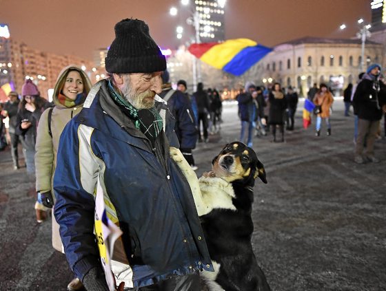 Telebistak esan badu, nola izango da bada gezurra? Orrialdeotan eskaintzen dugun argazki handia aurtengo otsailaren 13an ateratakoa da, Bukarest hiriburuan, Gobernuaren aurka egindako manifestazio batean. Bertan ageri den herritarra bere zakurrarekin irten zen kalera bere haserrea adieraztera.