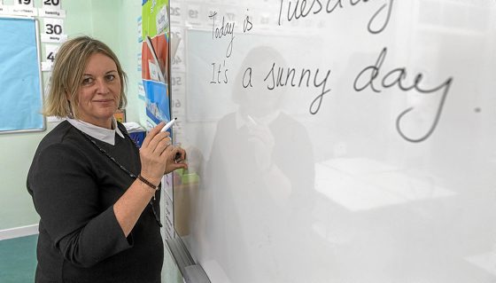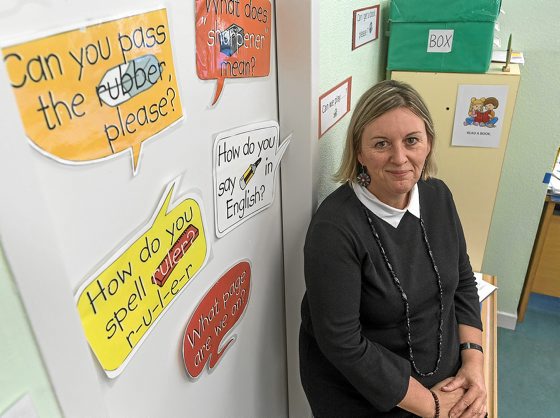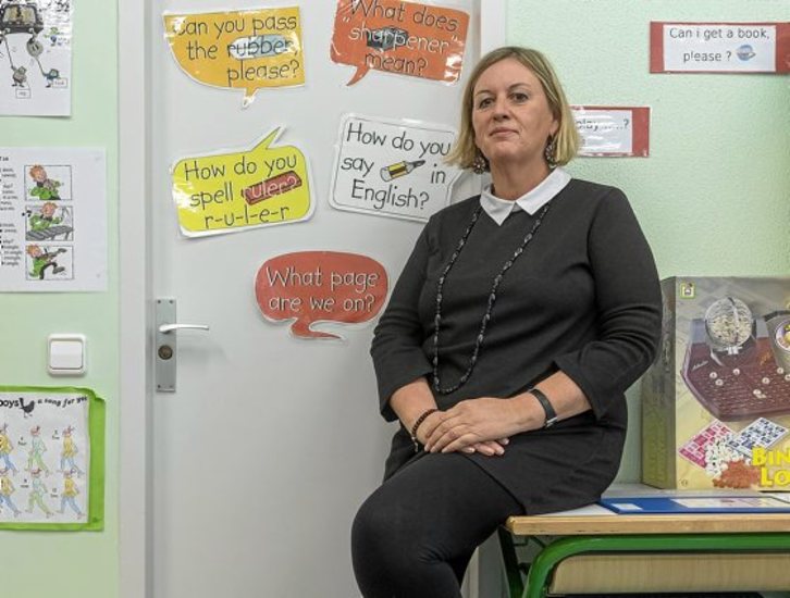 «Azkenean atera nuen bigarren profila eta egin nituen oposizioak». Eta Barrutia ikastolan, Gasteizko Lakua auzoan dagoen ikastola publikoan, atera zuen plaza. «Zorte handia izan nuen», dio ingeleseko eskolak ematen dituen irakasleak. «Ikasleekin euskara eta ingelesa erabiltzen ditu», gaineratu du. Ahal duen guztietan ingelesa erabiltzen du Lehen Hezkuntzako ikasleei irakasteko, «baina errieta egiteko euskara erabiltzen dut!», dio txantxetan.