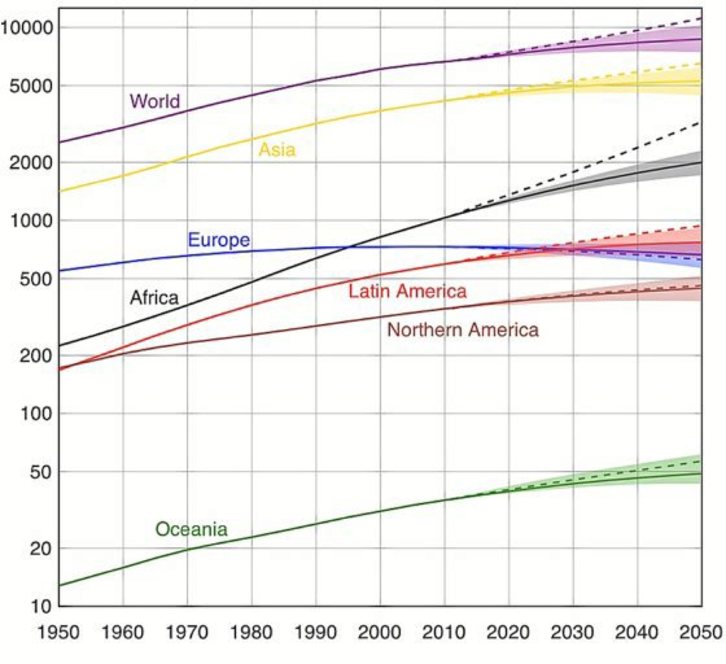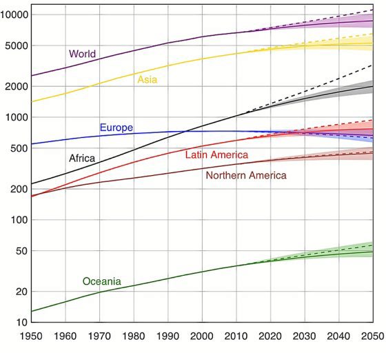 Dena dela, Afrikako biztanleriak izango duen hazkuntza da deigarriena, egungo 1.200 milioiak 2.500 milioi izatera igaroko baitira. Ozeaniak ere, bere txikitasunean, %40ko igoera bat jasango du 57 milioi biztanle izatera heldu arte. Amerikaren kasuan, igoera apalagoa izango omen da. Iparraldean %34ko igoera aurresaten bada ere, Kariben eta Hego Amerikan %24koa izango da igoera, hurrenez hurren 435 eta 780 milioira heldu arte. Europa da biztanleria handituko ez den herrialde bakarra, eta 35 milioi biztanle galduta, 715 milioi europar izango ei gara XXI. mendearen erdian.