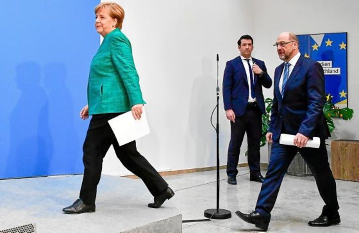 Lau hilabete luze behar izan ditu Angela Merkel Alemaniako kantzelariak iraileko hauteskundeetan lortu zuen emaitza pirrikoa garaipen politiko bihurtzeko. Koalizio Handia berresteko akordioak arnas ederra eman dio, argazkian ageri duen pausu sendoak eta bere betiko aurpegi tinkoak erakusten dutenez. Atzean, mekano baten ibilera automatikoa darama prentsaren aurreko agerraldira bidean kopetilun ageri den Martin Schulz SPDko presidenteak. Atzerri Ministerioa lortu du orain iazko hauteskunde bezpera arte Europako Parlamentuko presidentea zenak; beraz, atzerri gaietara itzuliko da. Alemaniako sozialdemokratei uzten dien auzia ez da, ordea, txantxetakoa. Alderdiaren militanteek gobernu akordioa berretsi edo ez erabakiko dute erreferendumean. Eta erabakia bata edo bestea izan, ez dirudi SPD alderdi historikoa egungo ekaitz giroa saihesteko gai izango denik. Dabid Lazkanoiturburu