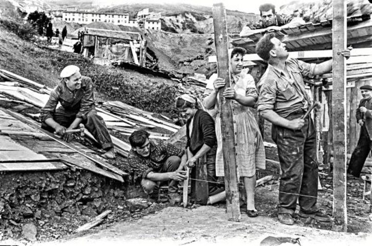 Egile ezezaguneko irudi hau joan den mendeko 60ko hamarkadan Bilbon zeuden txabola eremuen gaineko erreportaje batekoa da. Erreportajeak txabolen eraispena eta Uretamendiko auzo berriaren eraikuntza erakusten du, besteak beste. Uretamendin 1948an hasi ziren txabolak eraikitzen; legez kanpokoa zenez, gauez eraikitzen zituzten, eta, behin eraikita, ezin zituzten eraitsi. Eraikitze lanetan, beste txabolista batzuen laguntza izaten zuten. 300 familiatik gora bizi ziren txaboletan, gehienak inguruneko fabriketan lan egiten zuten immigranteenak. Han bizi zirenetako batzuek kontatzen zutenez, asfaltozko geruzaz estalitako zurezko xaflekin eginda zeuden. Barruan, gatzetan jarritako sardinzarren kaxekin egindako oholtza bat erabiltzen zuten zoru gisa. Ez zuten zerbitzurik; beraz, batzuetan euri ura erabiltzen zuten, baita Uretamenditik gertu edateko ura ematen zuten iturrietakoa ere. Kanpoan ez kalerik ez zoladurarik ez zegoenez, euria egitean ingurua lokatzez betetzen zen.