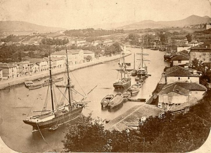 Irudia 1874koa da, gutxi gorabehera, Bilbon bizi zen Charles Monney argazkilari frantsesak egindakoa. Uretan gora hartuta dagoenez, erreferentzia hidrografikoa alderantzikatuta dago, alegia, ezkerrean eskuinaldea ikusten dugu. Argazkiak Olabeagako bihurgunean jartzen du arreta. Ibai-trafiko handiko gunea zen garai hartan, baita belaontzien amarratze lekua ere. Goiko aldean, eskuinean, 1871ko Miserikordia Etxea ageri da, Antonio Goicoechea arkitektoaren lana. Ezkerreko aldean, Deustuko erriberako aurrealde arkitektonikoa, gaur egun ere oraindik zutik dena, aldaketa ugarirekin bada ere. Irudi hau Bilboko setioa gai duen album batekoa da. Gaur egun albumaren zenbait ale geratzen dira. Albumean Bigarren Gerra Karlistan Bilboko segurtasun hesia osatzen zuten bateriak agertzen dira 57 argazkitan, Armadaren Bateria, Txoritokikoa edo Heriotzarena, besteak beste. Boluntario laguntzaileen erretratuak eta Morro eta Miravillako gotorlekuen barrualdea ere agertzen dira argazkiotan.