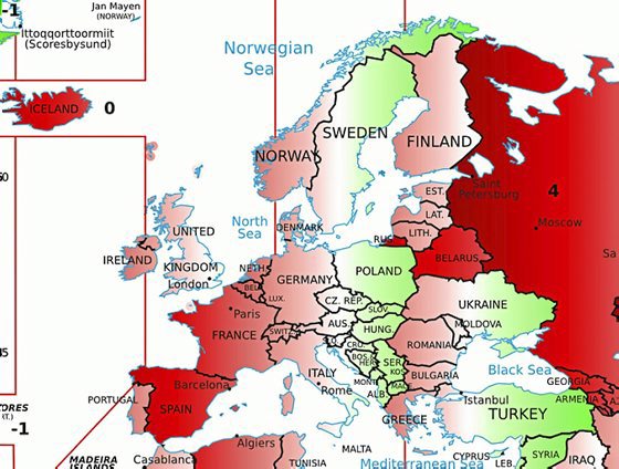 Stefano Maggiolok egin mapak erakusten duenez, Galiziatik Errusiako mugara arte ordu bera dugu eta horrek lurralde gehienek eguzkiarekiko atzerapena izatea dakar, mundu mailan nagusi den joera bide batez, duela bost urte “Hogeita hiru orduko egunak” artikuluan azaltzen nuenez.