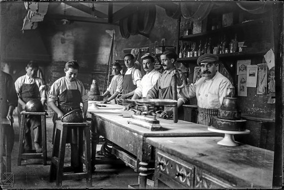 Gasteizko Garcia gozo dendako lantegia, 1918an. Aurrean, eskuinean, Pedro Garcia jabea, Alberto Schommer argazkilariaren aitona. Gozo denda Dato kalean zegoen. 1929an, Teresa Garcia, Pedroren alaba, Jose Goya halaber gozoginarekin ezkondu eta beren negozioak batu zituzten. Bonboi berezi asko sortu zituzten, hala nola «vasquitos» eta «nesquitas» ezagunak, trufak, turroiak, marmeladak eta beste gozoki batzuk. Argazki honen egilea Balbino Sobrado ekintzaile eta argazkigintzaren zalea izan zen, oso gaztetatik Bordelen gozogin eta gozogintzaburu bezala lan egin zuena. Motoen zalea ere bazen, eta taxilari gisa lan egin zuen sidekar batekin. Horrez gain, 20ko hamarkadaren hasieran motozikleta salmenta eta konponketa tailer bateko arduraduna izan zen Gasteizen. Gaztetatik zuen argazkigintzarako zaletasunak zenbait sari ekarri zizkion, eta erakusketa batzuk ere egin zituen.