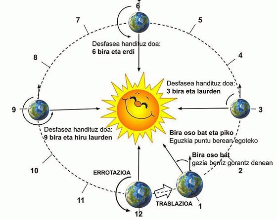 Irudian, erloju bat bailitzan, hamabi eguneko translazio hipotetikoaren eskema egin da. Lehenengo eguna pasa denean, Lurrak bere buruari buelta bat eta piko (30 bat gradu kasu honetan) eman behar dio harik eta Eguzkia posizio berean egongo bada. Egunez egun, desfase hori handituz joango da, edo, bestela esanda, eskema honetako egun bakoitzean 390 graduko errotazioa egin beharko du Lurrak. Translazio osoa amaitu duenerako, hamabi egunen buruan, Lurrak bere buruari hamahiru bira oso eman dizkiola erraz ikus dezakegu. Bada berdin gertatzen zaigu benetako 365 eguneko urtearekin, edo bisurte honetan lez, 366 egunekoarekin. Denbora horretan egunero 360/366 gradu gehiago errotatu behar du Lurrak (ia gradu bat gehiago eguneko), Eguzkiaren inguruko bidaia osoa amaitzean bira oso bat gehituz bere errotazioari. Hala bada, bisurte honetan, Lurrak 367 bira emango dizkio bere buruari. Izan daitezela buruari beste horrenbeste bira emateko bultzada! •
