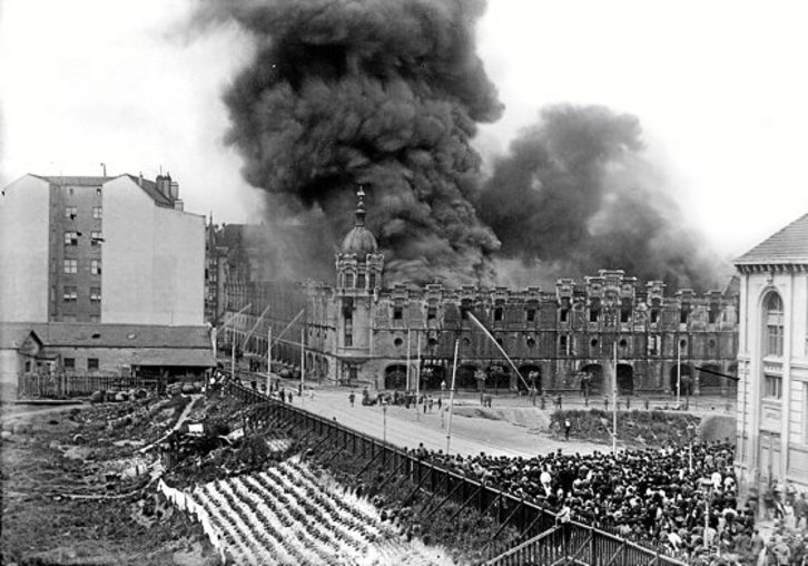 1919ko maiatzaren 21ean, goizeko lauretan, sute handia piztu zen Bilboko alondegian. Alkohol biltegi batzuetan hasi zen. Sutea itzaltzeko lanetan, suhiltzaileak iritsi arte, inguruko bizilagunek parte hartu zuten. "El Liberal" egunkariak lehen orrialdean jaso zuen gertaera, eta honela zioen: «Sute ikaragarria Alondegian». Malagatik ekarritako 200.000 litro olio eta ardo eta kontserba kantitate handiak erre zirela ere aipatzen zuen. Itzaltze lanetan Alejandro Aretxabala suhiltzailea hil eta beste bederatzi zauritu ziren. Hilaren 21eko gauean eraikinak sugarretan zirauen eta Errekalde Zumarkalera ematen zuen zatia erori egin zen. Ikusnahiak bertaratu zirela ere bazioen berriak: «Arratsaldean, gazte jostun asko alondegira joan ziren tailerreko lanak utzita». Pertsona askoren deiadarrak ere jaso zituen: «Hau zoritxarra! Bilboren hondamena da!». “La Gaceta del Norte” egunkariak «ikaragarrizko sutea» eta 30 milioi pezeta baino gehiagoren galera aipatzen zituen lehen orrialdean. “Nerbioi” arratsaldeko egunkariak «Udal alondegiaren sute izugarria eta suntsiketa» izenburua jarri zuen, eta zenbait argazki argitaratu. Autore ezezaguneko irudian, suhiltzaileak sutea itzaltzen ageri dira, eta jende asko tragediari begira. Argazkia Fernandez del Campo kaleko eraikin batetik egina da, etxadiaren erdialdetik. Errekalde Zumarkaleko izkinako alondegiaren fatxada xehetasun gehienekin ikusten da, baina ez osorik. Eskuinaldean orube huts bat dago, agertzen den eskola eraikinaren aurrean. Eraikin horrek oraindik badirau, pixka bat aldatuta; 1933an Rag Garajea eraiki zuten bertan, 2011n eraitsitako obra arrazionalista nabarmena.