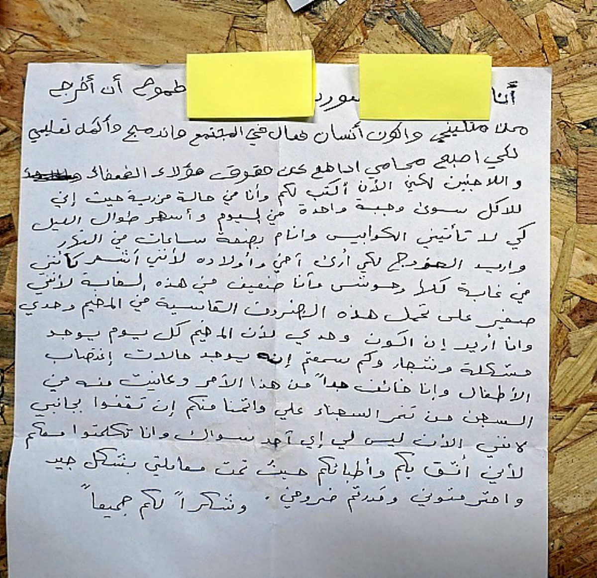Era berean, kanpalekuko borroken eta arazoen beldur zela adierazi zuen gutunean, «askotan entzun izan ditut haurrak bortxatu izanaren istorioak». Siriako espetxe batean beste preso batzuen jazarpena jasan zuela gogorarazi zuen.