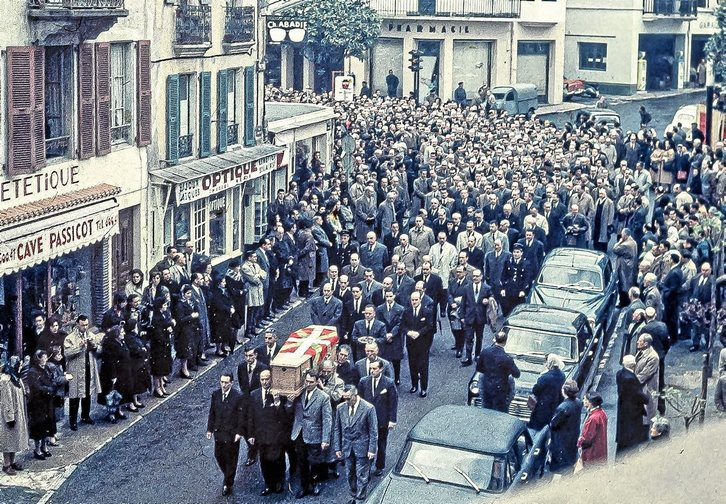 Jose Antonio Agirre, 1936ko urrian eratutako lehen Eusko Jaurlaritzako lehendakaria, 1960ko martxoaren 22an hil zen Parisen. Martxoaren 27an, igandean, Donibane Lohizunera iritsi ziren haren gorpuzkiak. Telesforo Monzon eta M. Josefa Ganuzaren etxean jarri zuten beilatokia. Hilaren 28an, astelehena, goiz triste, gris eta euritsu bateko 9:00etan, hileta segizioa atera zen. Zenbait batailoitako gudariek hilkutxa zeramaten; atzean, Kepa Ordoki Gernika batailoiko komandantea, zazpi herrialdeetako lur eskukada bana zeukan erretilu bat zeramana. 4.000 pertsona baino gehiago zeuden segizioan. Hilkutxa Saseta Batailoiaren Ikurrinarekin estalita zegoen. Ikurrin hura Gernika batailoikoa izan zen II. Mundu Gerran. Hiletaren ondoren, Agirreren gorpuzkiak Donibane Lohizuneko hilerrian lurperatu zituzten. Jean Velez argazkilariak, besteak beste, eta Pedro Garate amateurrak ekitaldi haien zuri-beltzeko argazkiak egin zituzten, eta Antonio Sarasuak filmatu egin zituen. Orain aspaldi ez dela, Donibane Lohizuneko kaleetan zehar joan zen segizio haren koloretako irudi batzuk agertu dira; haietan Ximun Haran, Mixel Labegerie, Telesforo Monzon, Leizaola eta beste pertsonaia batzuk ageri dira. Orain arte ezezagunak ziren argazki hauek Imanol Irigarai apaizak (1916-2004) egin zituen. Irigarai urdazubiarra argazkizale amorratua zen, eta bere kameren artean Leica M3 bat zuen.