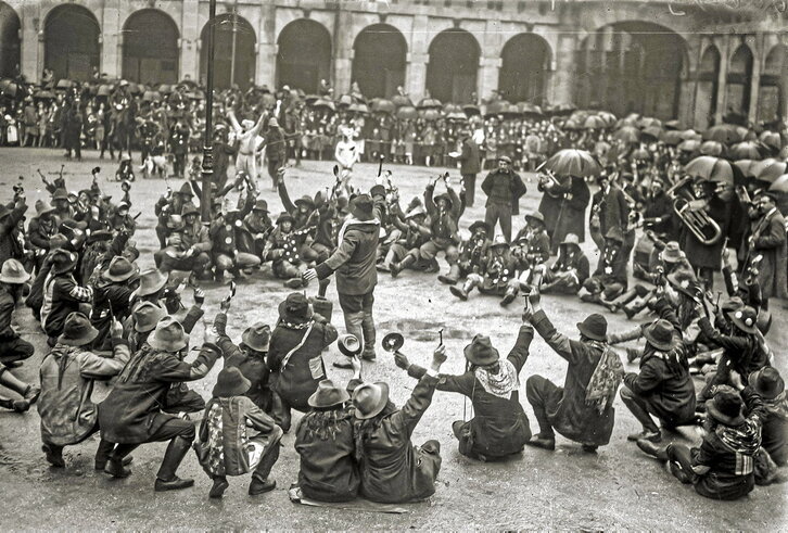 Raimundo Sarriegiren musikaren doinuez, otsailaren lehen larunbatean kaldereroen konpartsak ateratzen dira Donostian. Historialari donostiar batzuen arabera, 1828ko inauterietako astelehenean Turkiako kaldereroen konpartsa bat atera zen sukaldeko tresnak joz. 1884ko otsailaren 2an, Kandelaria egunean, Hungariako Kaldereroen konpartsak lehen aldiz desfilatu zuen Donostiako kaleetan, La Union Artesana eta La Fraternal elkarteen eskutik. Artikuluak erakusten duen irudia 1926ko otsailaren 14an egin zen. Inauterietako igande hura, prentsak ondorengo egunetan jaso zuen bezala, euritsu esnatu zen baina «...eguraldi txarra egin arren, Euskal Billera elkartearen ‘kalderada’ pintoreskoa atera egin zen... Karabana hiru gurdik osatzen zuten, zazpi zaldik eta dagozkien zaldizkoek, hartzek eta laurogei kaldererok, musika banda batek jarraituta... Kaldereroen konpartsak izugarrizko arrakasta izan zuen... Konpartsak Donostiako kaleetan egindako desfilearen ondoren, bazkari bat egin zen elkartearen lokaletan. Ondoren, ohiko hitzaldien ondoren, tartean Ramon Zapirain Heraufset presidentearena; «...euskarazko poesia inspiratu bat irakurri zuen Felipe Casal jaunak».