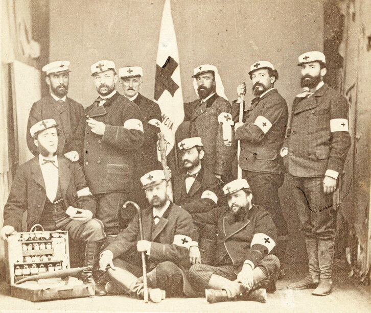 1863an Gurutze Gorriaren Nazioarteko Batzordea sortu zen. Lehen urte haietan Nicolas Landa mediku militar liberalak oso aktiboki parte hartu zuen, urte batzuk geroago Iruñeko “Euskera” aldizkariaren sortzaileetako bat eta Donostian argitaratutako “Euskal-Erria” aldizkariaren kolaboratzailea izan zenak. II. Karlistaldian eta 1872ko maiatzaren 4ko Orokietako guduaren ondoren, Landak, Orokietako zaurituei laguntzeko, Gurutze Gorriaren lehen anbulantzia izango zena antolatu zuen. Anbulantzia ez zen gaur egun ezagutzen ditugunak bezalakoa; garai hartan gurdi, andazain, mediku, erizain eta osasun-langileen multzoa zen. Maiatzaren 5ean argazkilariarentzat posatu zuten, Orokietan, anbulantziako kideetako batzuek: Nicolas Landa banderari eusten, Palacios eta Oskia mediku kirurgialariak, Borra farmazialaria, Moratel praktikantea eta ospitaleko laguntzaileak: Iturralde Suit, Bonifacio Landa, Lagarde eta Egozkue. Argazkian espedizioaren gidaria ere agertzen da, Agirre.