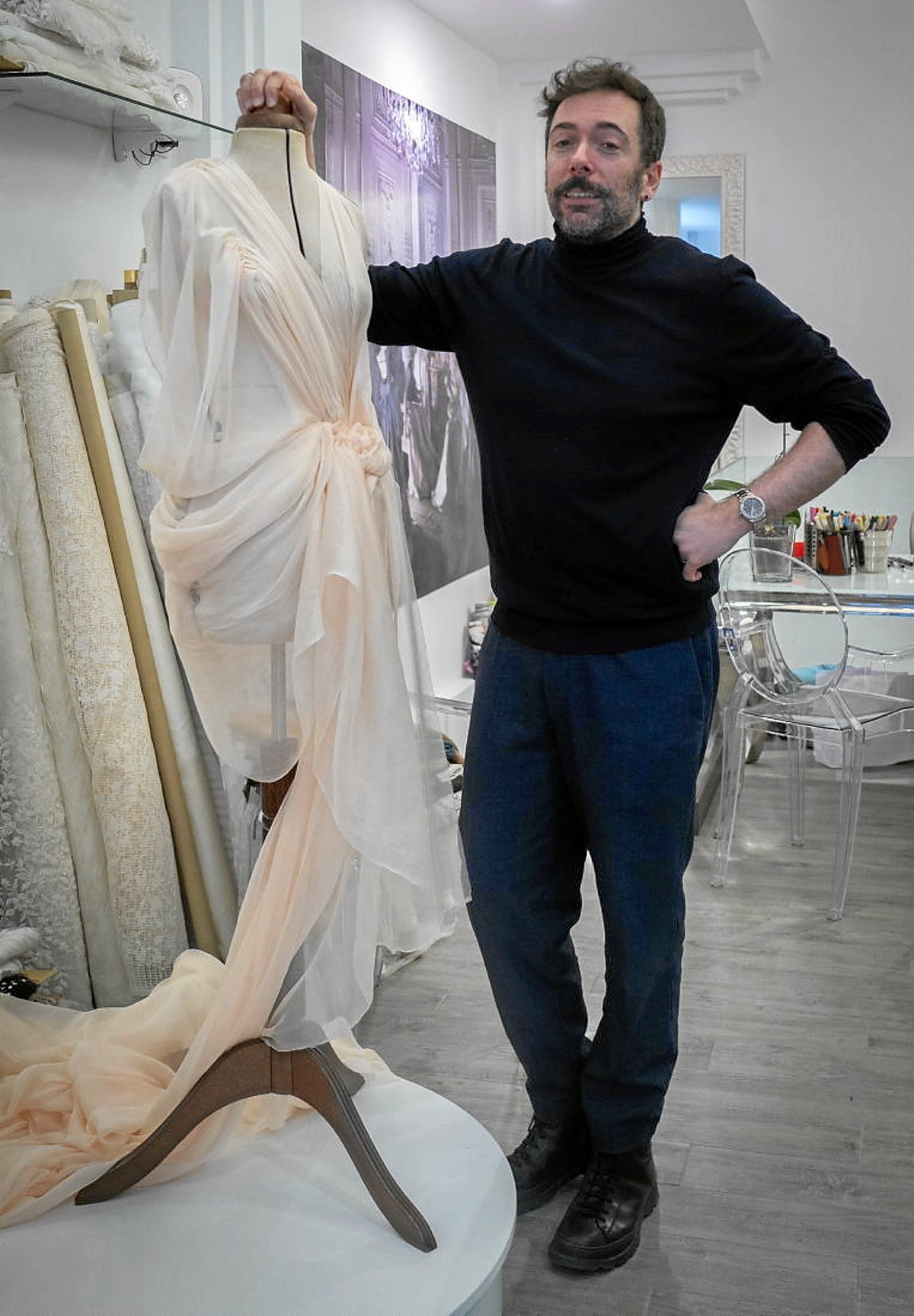 Badu eskarmentua Gorka Cinterok jostun bezala enkarguz jantziak -ezkontzetarako edo okasio berezietarako soinekoak batik bat- egiten. “Cristobal Balenciaga” seriean bizitako esperientzia konta diezagun etorri gara bere lantokira. Ezustean jaso zuen Aitor Arregi, Jose Mari Goenaga eta Jon Garañoren proposamena, Alberto San Juanen eta figuranteen coach lanak egitea.