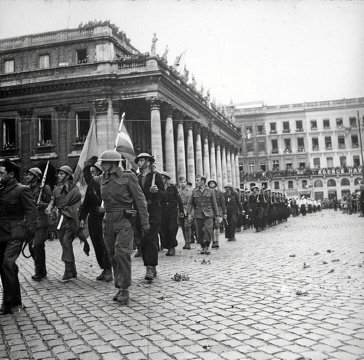1944an, erbesteko Eusko Jaurlaritzak Gernika Batailoia sortu zuen, lanbidez igeltseroa eta ANVko militantea zen Kepa Ordoki komandantearen agindupean. 1945eko apirilaren 14tik 20ra, Pointe de Grave-eko batailaren ondorengo askapenean, Gernika Batailoiak alemaniar posizioen aurka borrokatu zuen. Bost gudari hil ziren eta 35 zauritu ziren. Pointe de Grave askatu ondoren, batailoiko kide batzuk kondekoratuak izan ziren. Batailoiak apirilaren 22an desfilatu zuen Grayango aireportuan, eta han, De Gaulle jeneralak euskal tropak ikuskatu zituen. Esker onez, De Gaulle jeneralak hauxe adierazi zion Kepa Ordokiri: «Nire komandante hori, Frantziak ez ditu inoiz ahaztuko euskaldunek gure lurra askatzeko egindako ahaleginak eta egindako sakrifizioa». Argazkian, Gernika Batailoia ikus daiteke Bordelen zehar desfilatzen, Antzoki Handiaren aurrean, 1945eko apirilaren 26an, Gernikako bonbardaketaren urteurrenean. Lehen planoan, Kepa Ordoki komandantea eta Iguiñiz agurtzen, eta bere atzean Zubizarreta, ikurrinaren ondoan. Gernika batailoiaren ikurrinak Jose Antonio Agirre lehendakariaren hilkutxa estali zuen 1960an hil zenean.