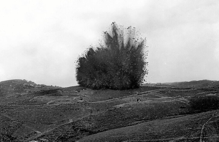 Argazki beldurgarri honek gatazka belikoren batean egina dagoela eman dezake, bai euskaldunok Bidasoaren bi aldeetan jasan ditugun gerretan, bai beste batzuetan. Baina ez da horrela. Irudi hau 1916an egin zen Hondarribiko Guadalupe gotorlekuaren inguruan, gure mendi eta baserrietako lurrak gerra eta suntsipenerako makineria probatzeko erabiltzen zituzten espainiar armadaren maniobra batzuetan. Makina hori bera erabili zuten Espainiako armadak eta haren aliatuek Rifeko gerra kolonialean, 1920ko hamarkadan, eta, urte batzuk geroago, 1936an, milaka euskal herritar hil eta hainbat herri eta hiri suntsitu zituzten bereizi gabeko bonbardaketetan.