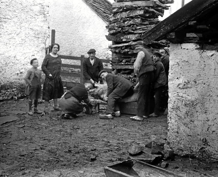 Artikulua ilustratzen duen argazkiak 100 urte inguru ditu eta Garralda herriko Ezkerrena etxean txerria hiltzeko tradizioaren une bat jasotzen du. Emakume bat terreinari eusten ari zaio, txerriaren odola jaso eta mugitzen duen bitartean, koagulazioa saihesteko. Une hori erabakigarria da, odola gero, odolkiak egiteko, beste osagai batzuekin nahastuko baita. Irudian, ezkerretik eskuinera, Orosia Pedrorena, Valentina Orbara, Cornelio Iriarte (argazkilariaren koinatua), Eusebio Pedrorena, Isidoro Orbara eta Manuel Pedrorena identifika daitezke. Argazkiaren egilea Jose Velasco da, jatorriz Leringoa (1897) eta 1974an Iruñean hila. Lanbidez maisua izan zen, eta hainbat zaletasun landu zituen; besteak beste, argazkilari, organista eta erlojugile aritu zen. Batzuetan, praktikante gisa ere jardun zuen. Garraldako lanaz gain, Oteitza, Lerin eta Eritzegoitin ere aritu zen maisu. Utzi dizkigun irudietan, 104 negatibo, gehienak familia girokoak dira eta Garraldako bizitzako hainbat une dokumentatzen dituzte, baita bere pertsonaiarik nabarmenenak ere; horien artean, Jesus Basiano margolaria.