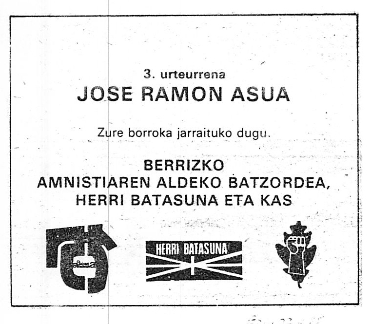 El impacto familiar sobre la desaparición-muerte de Asua fue de gran magnitud. Durante los años siguientes, la coordinadora KAS, Herri Batasuna y Gestoras pro Amnistía recordaron con una esquela en el diario ‘Egin’ el aniversario de la desaparición y muerte.