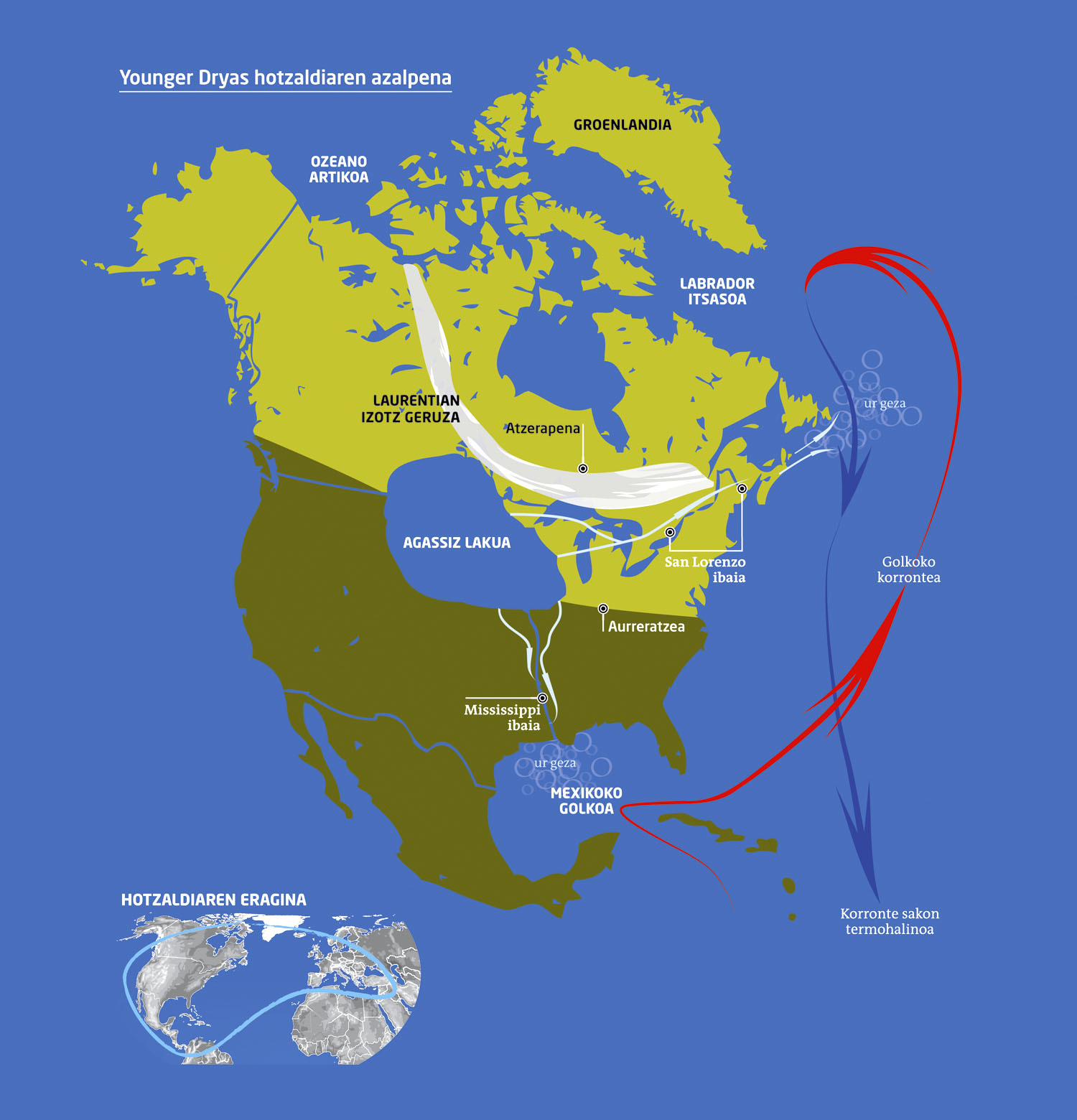 Golkoko korrontea berehala eten zen, eta hotzaldia hasi. Hotzaldi handia? Txikia? Nolakoa izan zen? Datuak, Aranbarrik: «Groenlandian 15 gradu jaitsi zen tenperatura batez beste, Ingalaterran bost gradu. Ekosistemen dinamika naturala guztiz hautsi zela pentsatu behar dugu. Baso hosto erorkorreko, eta klima mediterraneora egokitutako espezieak desagertu edo lekualdatu egin ziren. Estepa edo tundra bezalako paisaia sortu zen latitude borealetan. Glaziarren tamaina ikaragarri handitu zen Europan, eta gero eta lur azal zuriagoa hedatu, eguzkiaren berotze efektua murriztu eta hotzaldiak areagotuz. Younger Dryas garaia Agassiz lakua hustu arte luzatu zen, 1.200 edo 1.300 urtez».