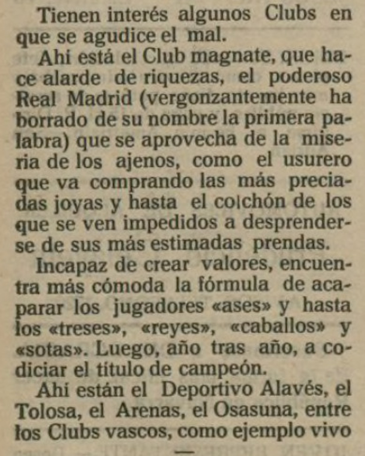 Volviendo a Patxi, en una nota de prensa de 1932 se refería así al Madrid: «Ahí está el Club magnate, que hace alarde de riquezas, el poderoso Real Madrid (vergonzantemente ha borrado de su nombre la primera palabra) que se aprovecha de la miseria de los ajenos, como el usurero que va comprando las más preciadas joyas y hasta el colchón de los que se ven impedidos a desprenderse de sus más estimadas prendas. Incapaz de crear valores, encuentra más cómoda la fórmula de acaparar los jugadores “ases” y hasta los “treses”, “reyes”, “caballos” y “sotas”. Luego, año tras año, a codiciar el título de campeón».