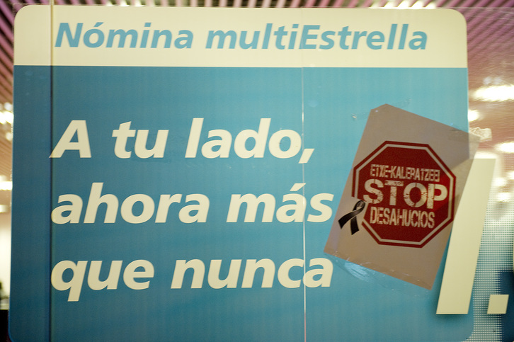 Pegatina contra los desahucios colocada en un banco de Barakaldo. (Idoia ZABALETA / ARGAZKI PRESS)