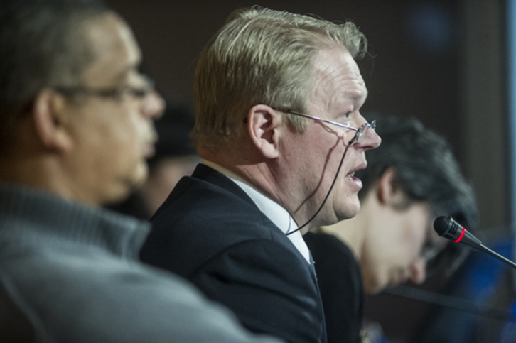 Aaro Suonio, en el centro, ayer en la sesión celebrada en Iruñea. (Jagoba MANTEROLA/ARGAZKI PRESS)