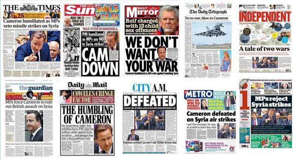 La prena británica ha resaltado el «fracaso» que supone la decisión del Parlamento para Cameron, basta con dar un vistazo a las portadas: