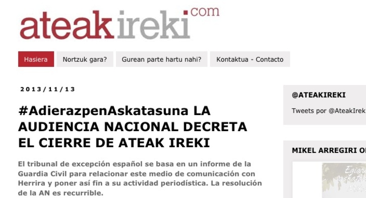 Ateak Ireki, a través de su página web, ha sido la que ha informado de la decisión de la Audiencia Nacional española de poner fin a este proyecto periodístico basándose en informes de la Guardia Civil que lo relacionan con el movimiento Herrira, cuyas de actividades fueron suspendidas por el mismo tribunal tras la redada en la que fueron detenidos 18 de sus miembros.