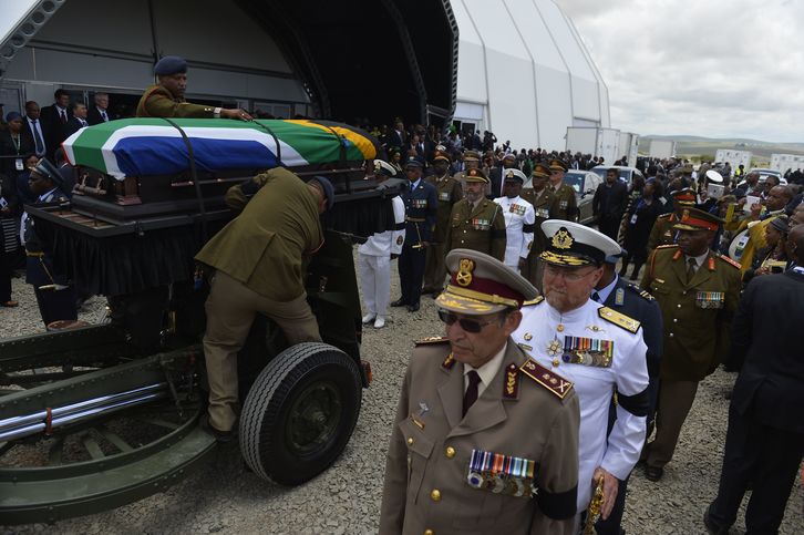 El ataúd ha sido trasladado al camposanto en una procesión militar y la bandera sudafricana que cubre el féretro ha sido retirada. Varios soldados han tomado posiciones para custodiar el féretro y ha sonado el himno nacional.