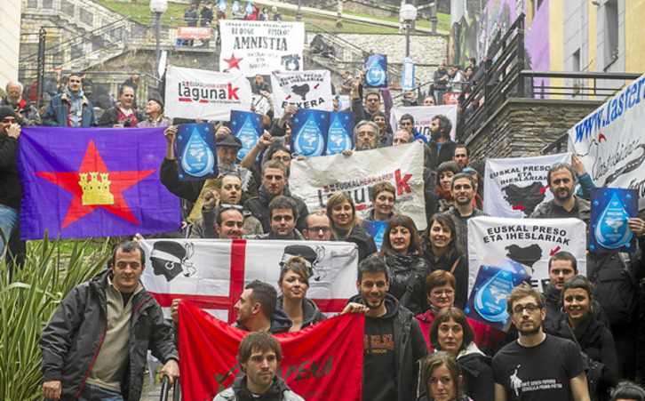 Tampoco faltaron integrantes de la red Euskal Herriaren Lagunak, habituales en esta movilización de enero, que además ya estuvieron en octubre en la redada contra Herrira. Posaron juntos a mediodía en la calle Ronda antes de unirse a la manifestación.