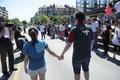 La organización ha llevado a cabo los preparativos para la cadena humana en los minutos previos a la gran cita. Ensayos y entrenamientos para esta gran movilización. Tú aquí, este allá, un poquito más cerca, a tu derecha, ahí, ahí… Y por fin ha llegado. Los eslabones se han entrelazado formando una histórica cadena humana durante media hora. Olas por aquí y olas por allá, fiesta e ilusión en un ambiente totalmente reivindicativo. Para el final, lluvia de aplausos de los asistentes.