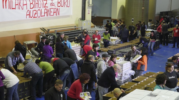 La iniciativa ciudadana Errigora ha congregado hoy a cerca de 120 personas en Ablitas, para realizar el montaje de las 12.000 cestas con productos del sur de Nafarroa que han logrado distribuir por toda Euskal Herria.