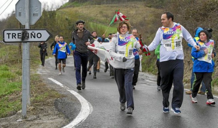 Siguió por Kuartango, Añana y Trebiñu, acompañada por un grupo bastante nutrido. Uno de los relevos del testigo correspondió a un militante de Izquierda Mirandesa, Burgos, muestra de la cercanía y el apoyo al euskara también por parte de quienes no son euskaldunes. Cuando tomó el mensaje, empezó a correr solo, pero al poco tiempo se le sumaron los compañeros de las furgonetas y también de la prensa. Empezó solo y acabó formándose un grupo de unas diez personas.