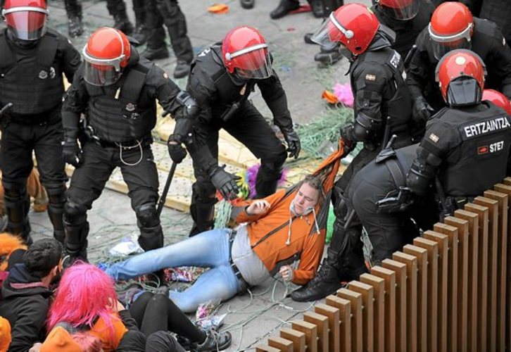 Continúa explicando que los nervios y el miedo se disiparon cuando miró a las personas que se encontraban junto a ella. Todos disfrazados, con la cara pintada, para proteger a Zaldibar, Robles y Esteban. «Para mí fue un orgullo participar en el muro popular», destaca antes de narrar la actuación policial que comenzó a las 8.30. Según relata, desde el primer momento la Policia Autonómica mostró una actitud «violenta, muy violenta. Yo estaba en la parte de abajo y vi que la Ertzaintza comenzó a retirar a las personas que estaban en la parte de arriba. Tenía miedo por los golpes que propinaban, ya que los ertzainas tenían una actitud muy agresiva», detalla la joven. No se libró de los golpes. Tras apartar a un nutrido grupo de personas de la parte superior, los agentes comenzaron a retirar a los congregados en la parte de abajo para poder acceder al andamio, situado en el centro del muro, y entonces un agente agarró a Gabirondo. No dudó en cogerle del cuello para sacarla de la plaza. Todo valía.