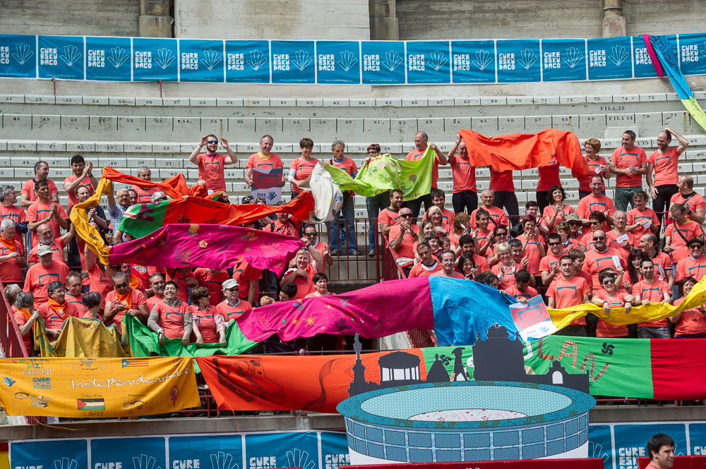En Iruñea, la cadena de telas que se han tejido en cada pueblo y barrio unirá a las 12.00 las plazas del Ayuntamiento, San Francisco, Santa Ana, Del Castillo y de los Burgos. A las 17.30, la Plaza de Toros vivirá una especie de aperitivo sanferminero. El objetivo es llenar este recinto por el derecho a decidir. En esta cita participarán artistas navarros de primer orden, que todavía no se han desvelado.