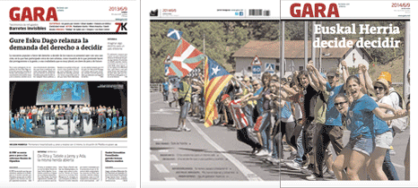 Portada de GARA del 9/06/2013 y la doble portada del año siguiente.