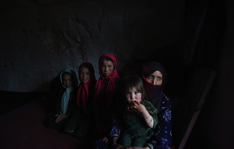 Una mujer sentada con sus hijos en su cueva en Bamiyán, a 200 km al noroeste de Kabul (Shah MARAI | AFP)
