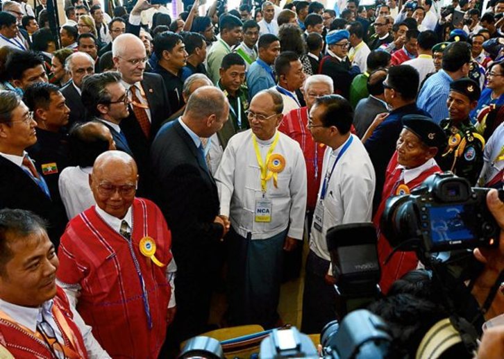 Tras casi dos años de negociaciones, el acuerdo nacional de alto al fuego –NCA por sus siglas en inglés– fue rubricado en la capital administrativa del país, Naypyidaw, por el presidente birmano, el exgeneral Thein Sein, y representantes de las ocho guerrillas étnicas que se ha avenido al pacto. «El NCA es una herencia duradera para las futuras generaciones», aseguró el líder birmano, quien insistió en que el camino «hacia un futuro de paz en Myanmar está abierto», después de que otros siete grupos armados se desmarcaran del pacto en las últimas semanas. La ausencia de estas guerrillas, además de la de otra media docena de ejércitos étnicos que fueron excluidos del proceso, ha deslucido el acuerdo de alto al fuego, la gran apuesta del presidente de cara a los comicios del 8 de noviembre, en los que opta a la reelección.