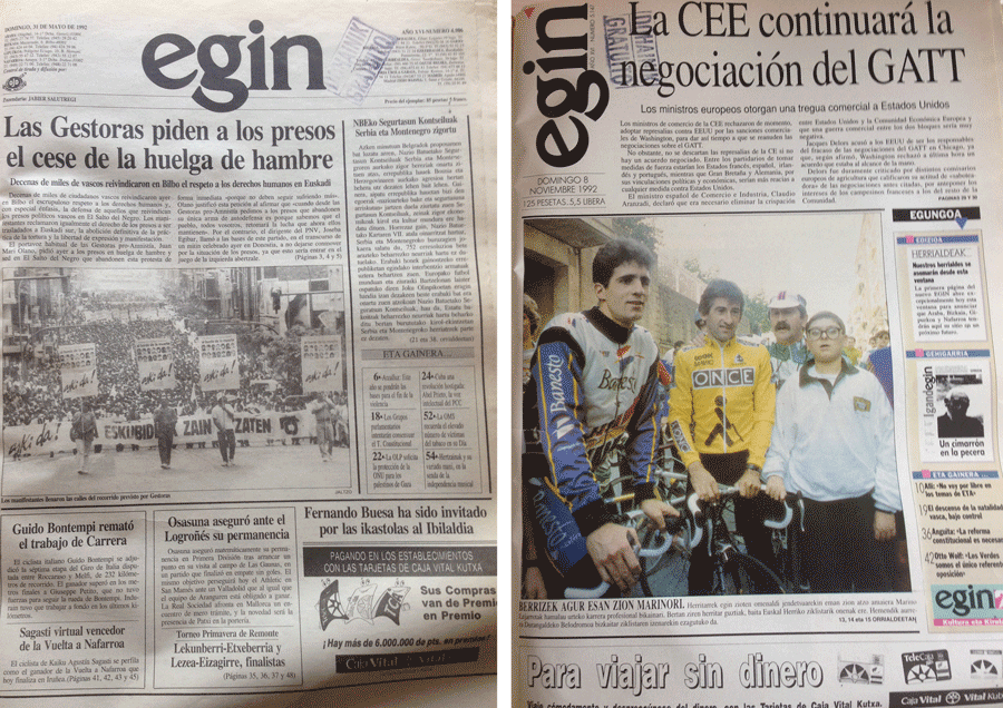 Primer ‘Egin’ firmado por Salutregi como director el 31 de mayo de 1992 y primera portada tras su renovación el 8 de noviembre del mismo año.