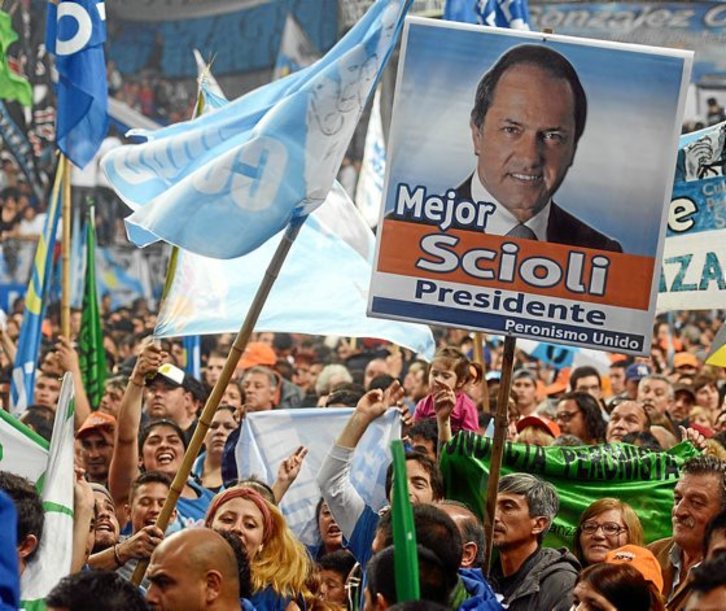 Daniel Scioli se presenta como un moderado que promete continuar el rumbo kirchnerista, «con los cambios que haya que hacer». Sustentado en los sectores más conservadores del Partido Justicialista (PJ), su candidatura representa un giro a la derecha respecto a los gobiernos de Néstor Kirchner y Cristina Fernández, provenientes de la misma formación.