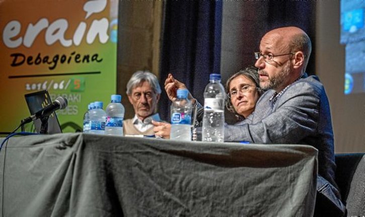 ¿Qué une a un profesor catalán de Ciencias Políticas como Jaume López y a un consultor empresarial de dilatada trayectoria como Koldo Saratxaga? Con acierto, y a diez días de las consultas del 5 de junio, la plataforma Erain Debagoiena realizó ayer en el teatro Santa Ana de Oñati, el experimento de juntar a estas dos cabezas pensantes, encuentro del cual emergió con fuerza un concepto de derecho a decidir ampliado, que más allá de la decisión puntual sobre el estatus político de una nación, interpela a la sociedad a pensarse a sí misma y preguntarse qué futuro quiere construir. Si alguien esperaba de la mesa redonda de ayer directrices y consejos de cara a las consultas del próximo 5 de junio, erró el tiro. Bajo la batuta de Zelai Nikolas, de Gure Esku Dago, López y Saratxaga abordaron conceptos como el derecho a decidir y la libertad desde ópticas y mundos diferentes, y al mismo tiempo convergentes.