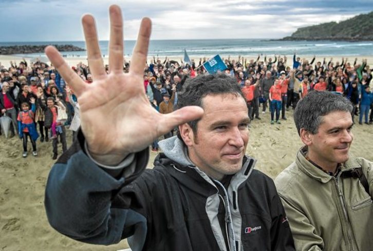 No hemos llegado aquí por casualidad. Gure Esku Dago se presenta en Ficoba el 8 de junio de 2013, diciendo que su objetivo no es una suma de fuerzas abertzales, sino construir unas bases democráticas en este pueblo. Convocamos una cadena humana de 133 kilómetros y decimos que para llenarla hacen falta 50.000 personas, pero claro, eso supone que estén con sus brazos totalmente extendidos para poder unirse. En ese 2013 el termómetro marca frío; este asunto no interesa, o no acaba de gustar cómo lo tratamos... Para entonces en Catalunya ya han salido a la calle dos millones de personas y se ha hecho una cadena humana no de 123 kilómetros, sino de 400. ¿Por qué? Porque los catalanes, harrokeriarik gabe baina harrotasunez, sin prepotencia pero con orgullo, a medida que han dado pasos han interiorizado una actitud y han decidido ser protagonistas. Por eso dijimos ya entonces que Gure Esku Dago no era un lema, era una actitud. El ambiente que entonces había aquí era muy diferente. ¿Qué hemos conseguido? Demostrar que podemos dar pasos juntos y que además necesitamos hacerlo, interiorizar esa actitud. Que el 5 de junio de 2016 haya 34 pueblos que pasen de las palabras a los hechos –porque también dijimos que no nacíamos para reivindicar sino para hacer– es algo grande. Sabiendo, además, que esta es solo la primera ola...