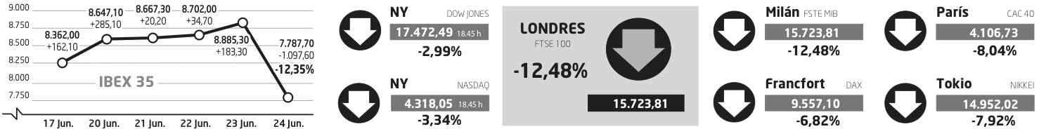 Las compañías con presencia en Gran Bretaña, por tanto, se derrumbaban sin paliativos ante las dudas y el previsto deterioro de su economía, pese a invocar un periodo muy corto de incertidumbre. Santander perdió un 19,89%, Sabadell, un 19,29%, Telefónica, un 16,12%, BBVA, un 16,18%, Iberdrola, un 10,20%, y Ferrovial, un 9,32%. Pero todavía peor lo hizo IAG, el holding que integra a British Airways, Iberia, Vueling y Aer Lingus, que se despeñaba un 26,86%, después de rebajar sus previsiones de beneficio para este año. En el Ibex, hasta 19 valores perdieron más de un 9%.
