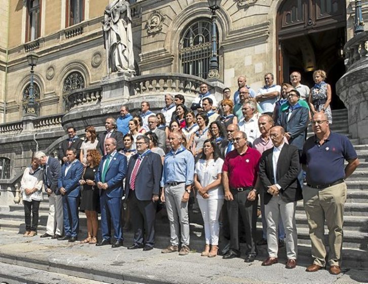 El alcalde de Bilbo informó de la detención del edil tras una concentración en las escalinatas del Ayuntamiento a la que asistieron representantes políticos e institucionales. EH Bildu, Udalberri y Goazen Bilbao, sin embargo, decidieron no acudir porque «se trata de una decisión unilateral tomada por el equipo de Gobierno, sin contar con la opinión de la mitad de los grupos municipales». Estos grupos criticaron en una nota que la decisión «unilateral» del Gobierno municipal «no respeta el protocolo de actuación conjunta frente a agresiones acordado con Bilboko Konpartsak, motor principal de estas fiestas populares», y añadieron que «es responsabilidad política de todos los grupos, también del equipo de gobierno, huir de cualquier atisbo de protagonismo cortoplacista partidista o institucional». A su juicio, los representantes institucionales deben priorizar las «convocatorias propuestas por el movimiento popular y el tejido asociativo». GARA