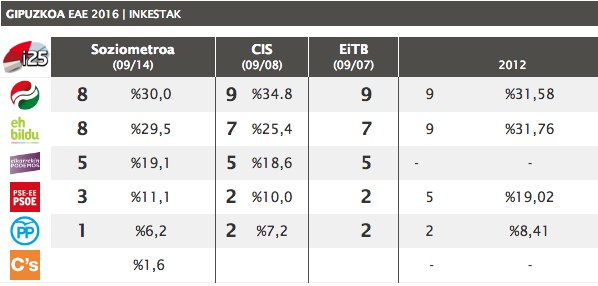 El PNV ganaría en todos los herrialdes y mantendría sus 11 escaños en Bizkaia y sus 7 en Araba. Solo perdería 1 en Gipuzkoa, donde quedaría empatado con EH Bildu a 8 parlamentarios –en los datos correspondientes a la intención directa de voto, la coalición aventaja a los jeltzales en más de dos puntos (19,4% frente a 17%), pero la estimación augura un empate técnico (30% para los jeltzales y 29,5% para EH Bildu)–.