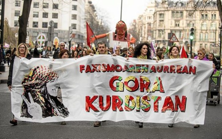 Cientos de personas expresaron ayer en las calles de Bilbo su solidaridad con el pueblo kurdo en una manifestación que contó con el apoyo de EH Bildu, Podemos y Ezker Anitza. Los organizadores alabaron «la dignidad que está demostrando frente a la dura represión que está sufriendo». Turquía está jugando «una sucia partida en esta guerra, con la complicidad y el silencio de la Unión Europea», denunciaron.