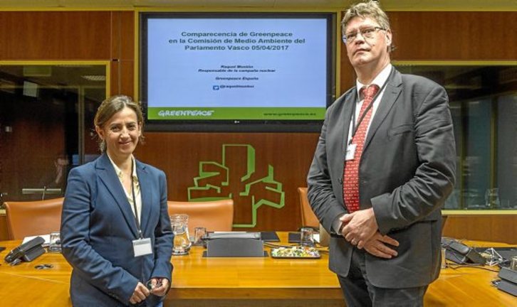 Raquel Montón es la responsable de la campaña antinuclear de Greenpeace y Jan Havercamp es miembro de Nuclear Transparency Watch. Los dos comparecieron el pasado miércoles en la Comisión de Medio Ambiente, Planificación Territorial y Vivienda del Parlamento de Gasteiz para hablar sobre Garoña y los pasos que pueden dar las instituciones vascas para impedir la reapertura de la central, que el pasado 8 de febrero recibió el visto bueno del Consejo de Seguridad Nuclear (CSN).
