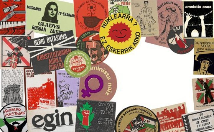 Es posible que haya algún lector o lectora que no se haya puesto nunca una pegatina en la pechera –o donde sea, pues no llevan manual de instrucciones–, pero es improbable. En todo tipo de movilizaciones populares, en fiestas, en favor de una causa determinada, esos coloridos adhesivos forman parte de nuestro atuendo cada vez que nos echamos a la calle para proclamar, reclamar o denunciar algo. Sirven para identificarnos, para vincularnos con una lucha o para hacernos partícipes de un proyecto colectivo. Muchos chavales decoran sus carpetas con ellas, y están quienes las utilizan para tapizar la pared de su dormitorio, para desconsuelo de padres y madres. Hay quien, incluso, las guarda y las colecciona por decenas, por cientos y por miles. Incluso en la época digital y en plena dictadura de las redes sociales, las pegatas perviven. Ahora, Euskal Memoria ha recopilado buena parte de las que han circulado por nuestro país en las últimas décadas, y el resultado es impresionante. Por la cantidad, y por la capacidad que en conjunto tienen de resumir lo que ha acontecido en Euskal Herria en el último medio siglo.