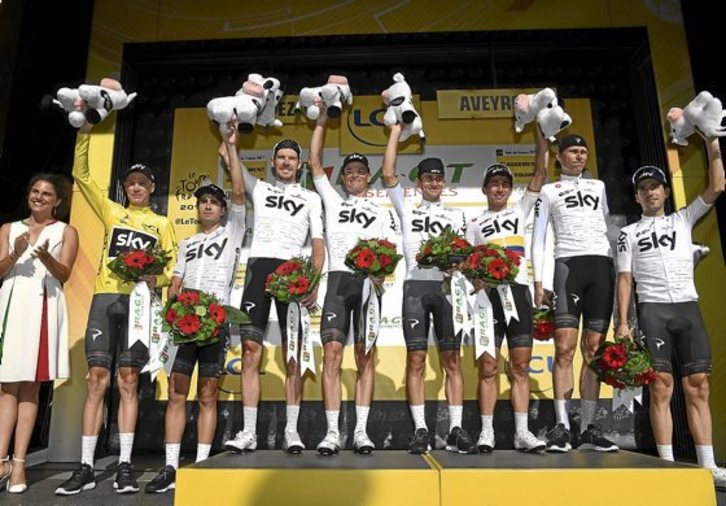 Por primera vez el ganador de la clasificación por equipos subió al podio ayer en el Tour al final de una etapa. Sky ordenó subir a los ocho corredores y con Landa situado junto a Froome vestido de amarillo para trasmitir una imagen de unidad alrededor de su líder tras dos días polémicos.