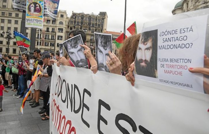 En la concentración realizada en la capital vizcaina, convocada por miembros de la comunidad argentina y a la que se sumaron organizaciones interna- cionalistas y en sindicato LAB, entre otros, participaron decenas de personas corearon consignas como «Santiago, non dago?», «Benetton boikot, Benetton kanpora» y «Ahora, ahora resulta indispensable aparición con vida y castigo a los culpables». Durante el acto, en el que se hizo un relato de los hechos y de las iniciativas realizadas hasta ahora, se denunció el intento de la autoridades argentinas de criminalizar la solidaridad en el marco de la represión del pueblo mapuche y se responsabilizó de lo ocurrido al Gobierno de Mauricio Macri y, en concreto, de su ministra de Seguridad, Patricia Bullrich.