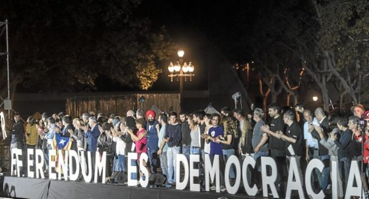 Los discursos políticos llegaron precedidos por “L’Estaca” cantada por una multitud que ya de noche ondeaba sus esteladas al grito de «Independencia». Duras críticas al Gobierno español y agradecimiento a los payeses, los estudiantes, quienes custodian los colegios electorales, representantes de colectivos inmigrantes, empresarios, medios de comunicación… Y es que el camino del 1-O ha implicado a todo un pueblo, que ha tirado de imaginación y resistencia para responder a las amenazas de Madrid. Todos ellos participaron ayer en el acto, como los miembros del cuerpo de bomberos que el jueves desplegaron una espectacular pancarta con el lema «I love democracy«. Ayer se reafirmaron en su compromiso: «Las calles serán siempre nuestras, y los bomberos seremos siempre vuestros». Colectivos que reafirmaron su compromiso y forman con letras gigantes la frase: «referéndum es democracia».